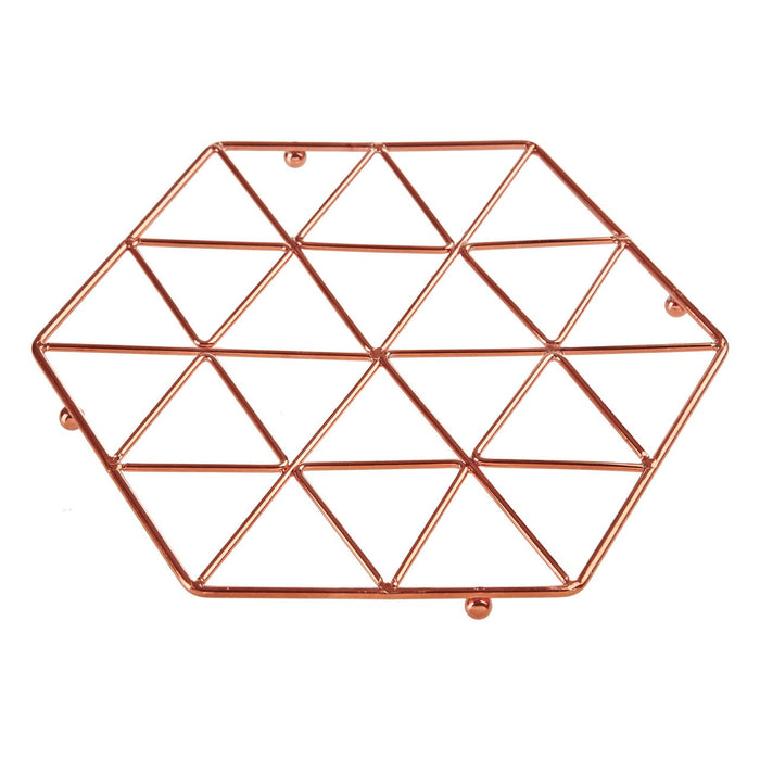 Ensure kitchen worktops are protected from hot pans with the polygonal Vertex trivet. Forming the shape of a hexagon, the strong iron wire frame features a warm copper plated finish that coordinates well with the Vertex utensil holder. Its series of triangular shapes combine to form a pleasing geometric pattern. Four small feet keep it slightly raised from kitchen surfaces, allowing air to circulate under the pot or pan.
