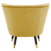 This exquisite chair boasts a barrel design back upholstered in sumptuous pistachio velvet, adorned with vertical channel tufting. The opulent aesthetic is elevated by the black wood legs with decadent gold finish accents.