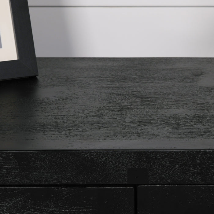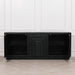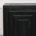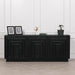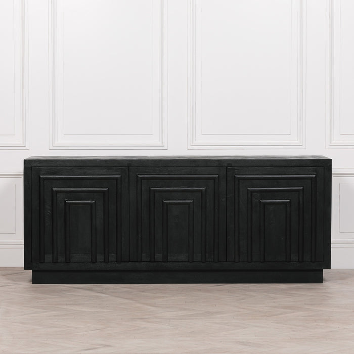 Black three-door sideboard with a contemporary front design and push spring loaded doors featuring internal shelves.