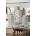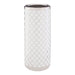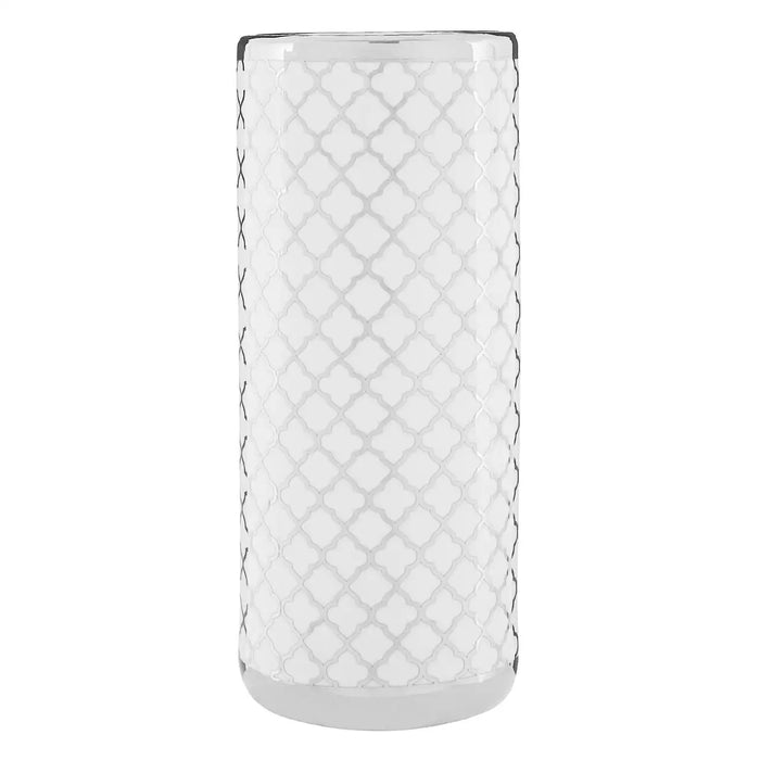 This elegant ceramic cylindrical umbrella stand has a geometric edge thanks to the magnificent quatrefoil designs that adorn it. The holder has a white base colour with silver-coloured quatrefoils to give it a shiny, reflected appearance. Its glitzy appeal is increased by the silver finish on the base and rim.