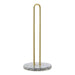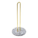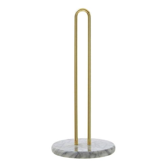 This roll holder will look contemporary sitting on the kitchen counter with its simple and sophisticated design. This freestanding kitchen roll holder has sleek brass finish metal rod which gently curves from the top to hold the paper towel in style. The elegant stand is supported by a round white marble base in grey decorative veining. This holder will provide a seamless release of paper when needed and will keep it off the counter and away from spills.