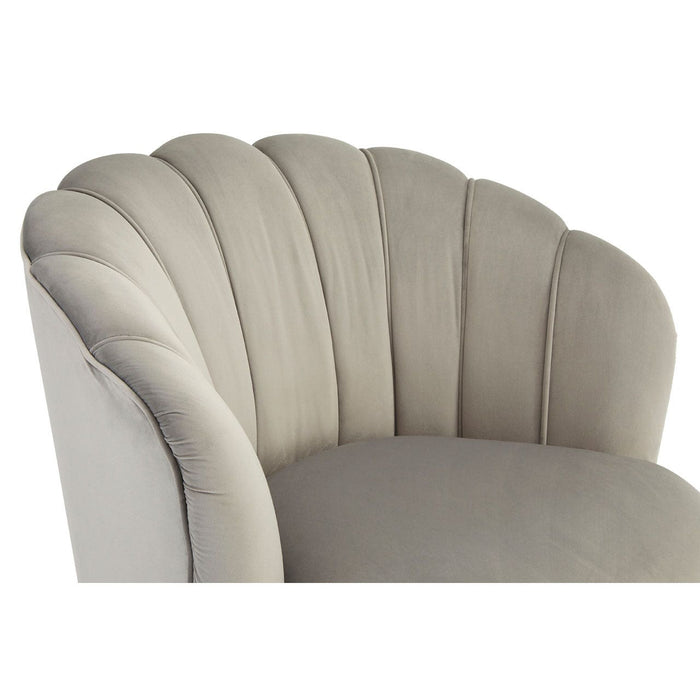 With its scalloped backrest this accent chair expresses glamorous art deco style. The Orlina chair combines sleek grey and warm gold tones with vintage lines for a luxurious motel Miami look. The chair is upholstered with tactile velvet, with a smooth seat surface that helps to accentuate the channel tufted detail on the backrest. Its legs are made from solid birchwood and are positioned at a slight angle.