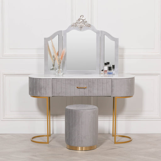 Vanity mirror in a silver French antique style with three mirror-folding compartments and motif detailing. Dimensions H68 X W86 X D2CM / MIRROR...