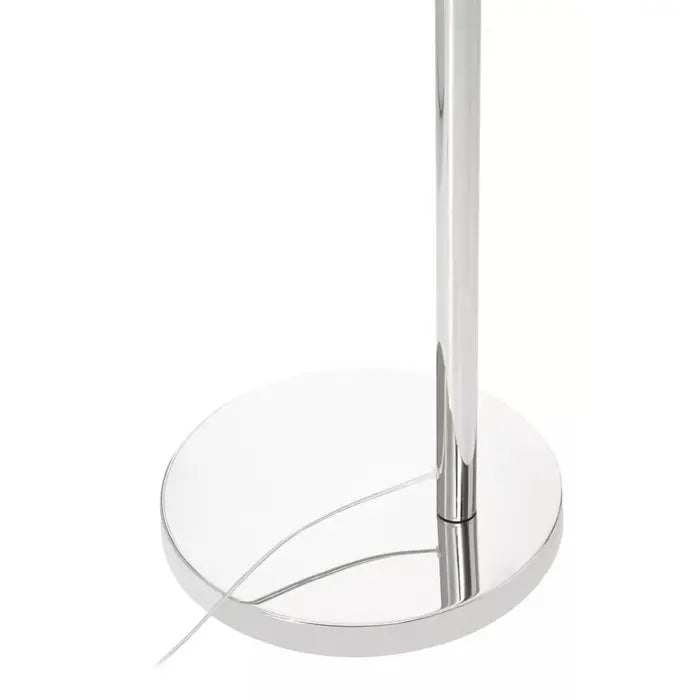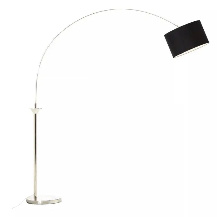 Crafted from satin nickel metal with a sleek arched frame and a round, midnight black fabric shade, this exceptional floor lamp exudes contemporary elegance. Its curved form is masterfully balanced by a sophisticated chrome base, making it the perfect addition to any space, whether used for reading or setting a cosy mood.