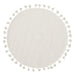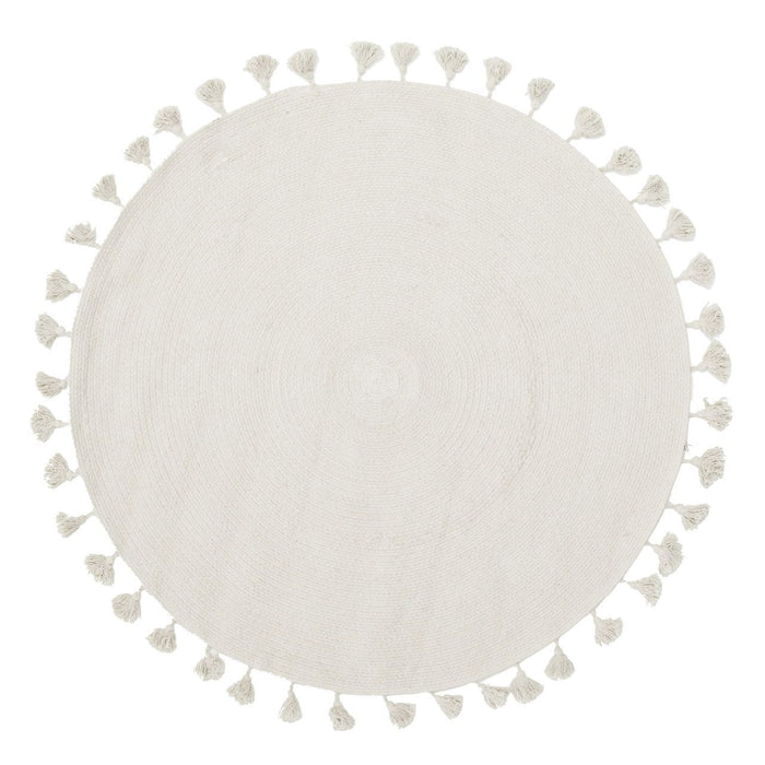 Exhibiting artisan craftsmanship, this round rug lends a timeless organic charm to the interior. This rug is intricately hand-woven from premium-quality fibre in a soft finish and features concentric circle patterns. The tassels around this rug create a playful accent on the floor, and it fits within different styles of living effortlessly.
