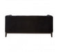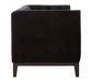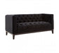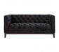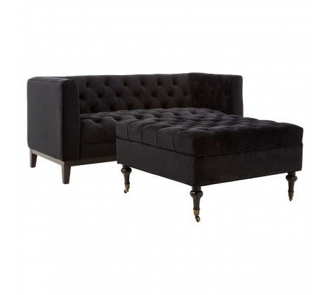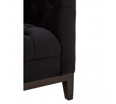 The Sasha two seat sofa is a button tufted statement piece that exudes boutique hotel sophistication. This large sofa is upholstered with sumptuous black velvet, its button tufted finish giving it a geometric look. Its angular and lean aesthetic represents a contemporary interpretation of the traditional Chesterfield design. The skirt and front arms have a smooth finish that creates a textural contrast with the sofa's quilted seat and backrest. The carved natural wood legs are coloured black for coordination.