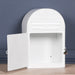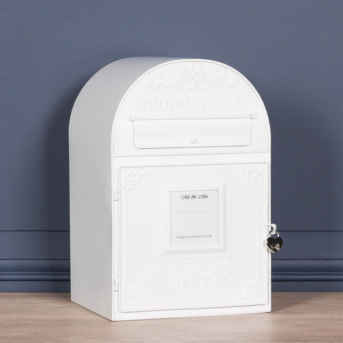 Decorative white wedding post box with gold heart shaped key padlock. The post box has anchoring points to be affixed to a wall or affixed to a table top.