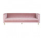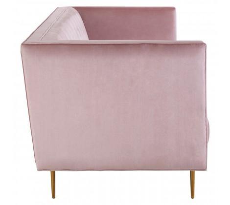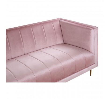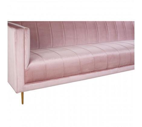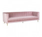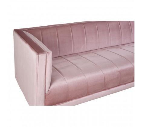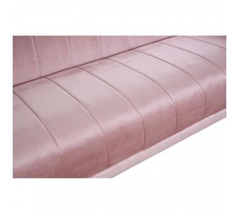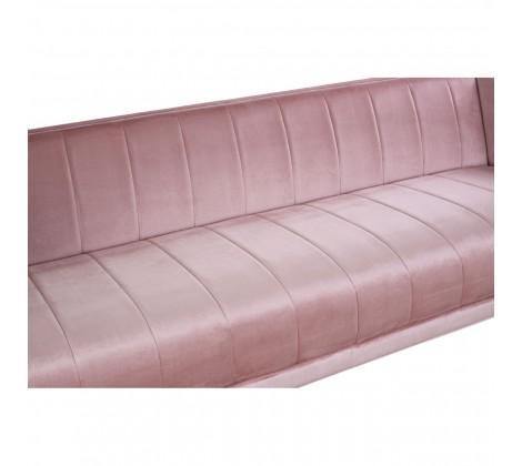 Upholstered in plush pink velvet, this three-seater sofa comes in thick padding featuring minimal channel detail. The warm metallic stainless-steel base furthers the luxe accent and harmonises with vertical lines along with the seat and backrest.