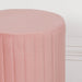 Pink velvet upholstered round stool with ribbed details and a gold trim base.