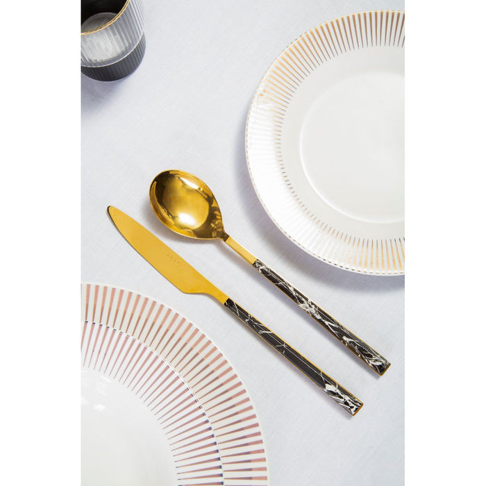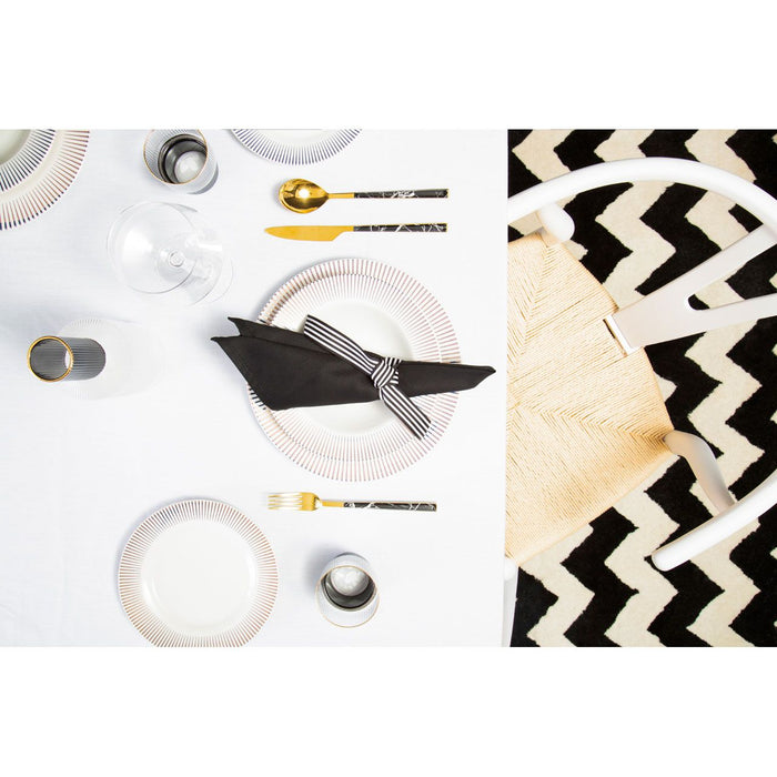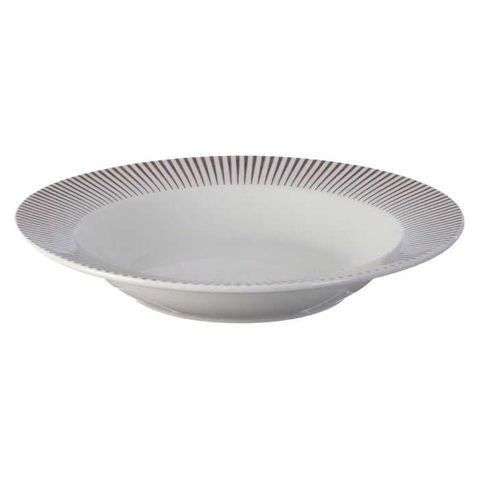 A contemporary dinner set made from porcelain with a metallic spoke pattern. The Avie dinner set is comprised of sixteen pieces. Each one has a clean white colour and a smooth glazed finish.