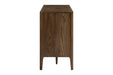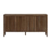 Four door brown sideboard, oak and oak veneer, visible grain with ribbed design at front. Removable shelving.