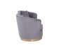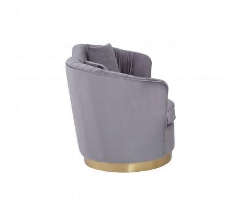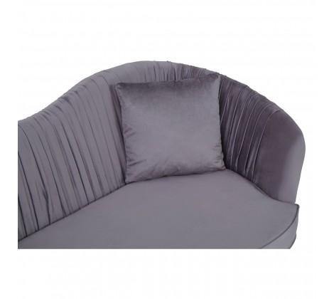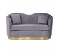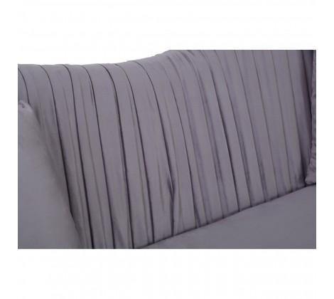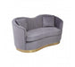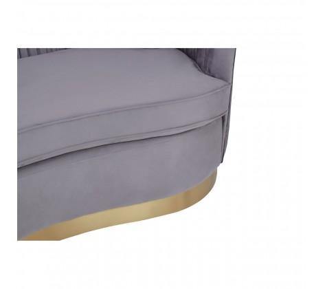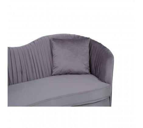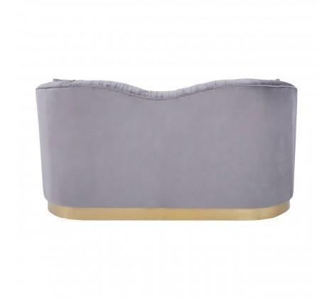 The two seater sofa has muted grey upholstery with thick padding and two matching cushions. The undulating back features pleated detail and a warm metallic band on the lower front adds to its luxurious look.