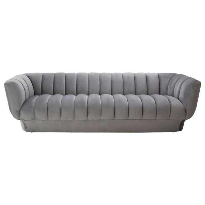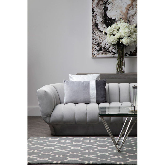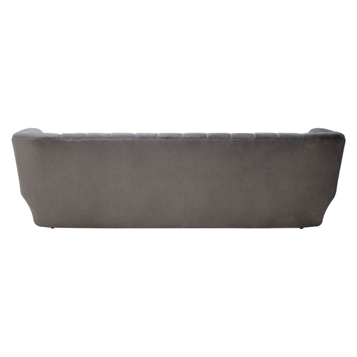 This sofa will make a sophisticated statement with its distinctive subdued fabric and vertically tufted detail. The Kenton three seater sofa is upholstered in light grey fabric which gives it a smooth, luxurious feel. The deep channel tufting on the seat, arms and backrest, forms a minimal texture and enhances thick foam padding beneath the soft fabric. This vintage inspired sofa has discreet stitching along the fine edges which coordinates with the clean lines of the design.