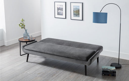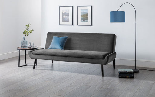 Beautiful and elegant soft grey velvet three seater sofa with ribbed back and arm detail. Finished with contrasting matt metal trim and legs. WEIG...