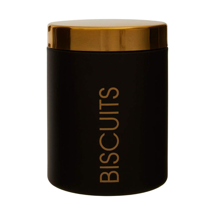 This biscuit canister will add a touch of elegance to the kitchen with its smooth black enamel finish and metallic lid. The Liberty biscuit canister is made from stainless steel and features "biscuit" lettering in a gold finish which is accentuated by the black base colour. A reflective gold finish lid securely fits on the top and gives metallic appeal to this container. The rubber gasket ring around the rim creates an airtight effect to keep the contents fresh for longer period.