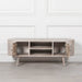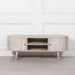 Wooden Mango TV cabinet suitable for televisions up to 50″ in size. The TV cabinet is made from Mango wood with a Blanchie washing to achieve a pale wood colour tone. (Please note: The product has no pre-cut holes in compartments. They can be added by end user by drilling hole in the mdf back panel. This gives the option to use for general storage or ability to add holes for use with console / entertainment systems).