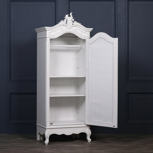 Single white painted wardrobe in a French antique style with mirrored door, featuring detailed wooden hand carve crown and legs. The internal featu...