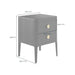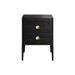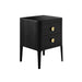 Two drawer black bedside table in dark stained solid oak and oak veneer, curved front, curved legs, cut lines, visible grain, metal runners on drawers and brass style round handles