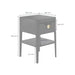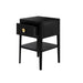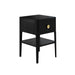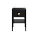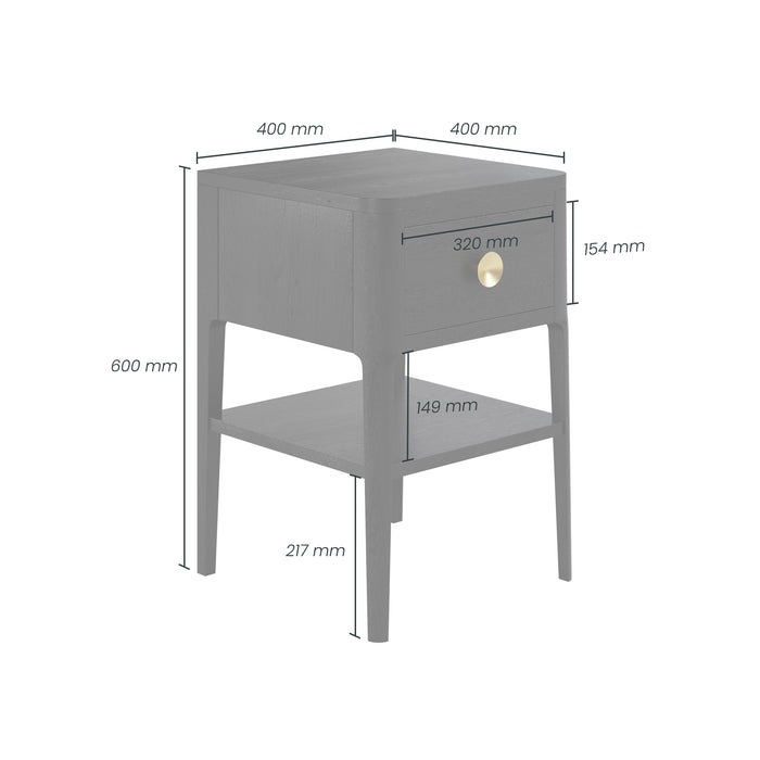 One drawer black bedside table with shelf, in dark stained solid oak and oak veneer, curved front, curved legs, cut lines, visible grain, metal runners on drawers and brass style round handle