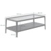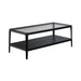 Black coffee table in dark stained solid oak and oak veneer, glass top, curved edges and legs, cut lines, visible grain, shelf