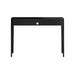 One drawer black console table in dark stained solid oak and oak veneer, curved front, curved legs, cut lines, visible grain, metal runners on drawers and brass style round handle