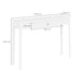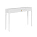 One drawer white console table in white stained solid oak and oak veneer, curved front, curved legs, cut lines, visible grain, metal runners on drawers and gold coloured square handle