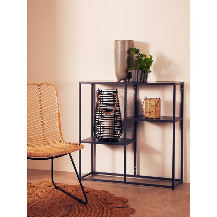Crafted from durable, powder-coated metal, this multi shelf unit provides convenient and functional display options. Its sleek design boasts clean lines and adjustable lower shelves, allowing for versatile storage solutions.