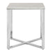 The Allure end table's square surface is supported by latticed legs made from polished metal.