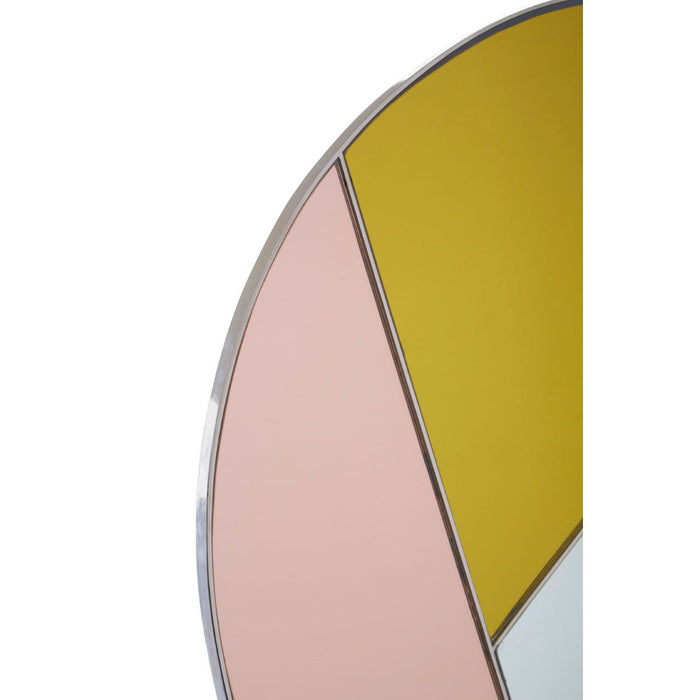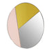 The Arbus round wall mirror's distinctive design references modern art. Separated by strips of stainless steel, the round Arbus wall mirror features three geometric segments, each a different size, colour and shape. One semicircular segment has a rose gold finish, while another has a rich gold finish. The largest segment is created from mirrored glass. Coordinate with plush tone and warm metallic accessories.