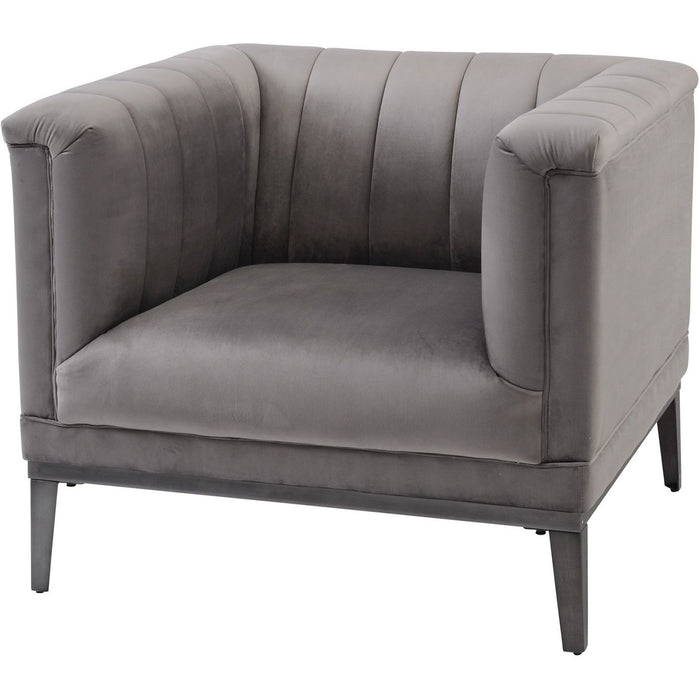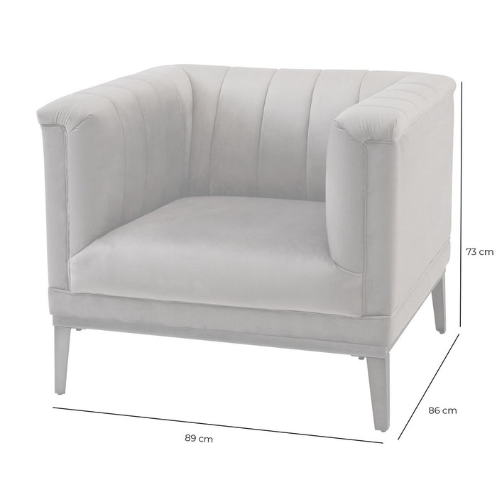 Beautiful and elegant soft grey velvet occasional chair with ribbed back and arm detail. Mounted on a contrasting gun metal stainless steel frame.