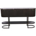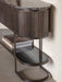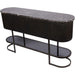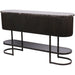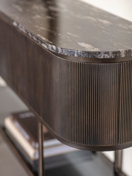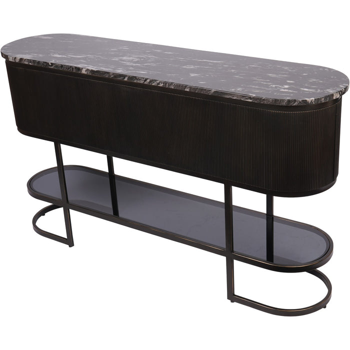 The Belvedere Aged Black Console Table exemplifies contemporary, space-saving design. This elegant console features a smooth gilded dark bronze frame, black tinted glass, and beautiful Markino Marble. It has a glass shelf with a clearance height of 25cm. The natural materials used ensure that each piece is unique and gold is used in highlights to contrast against the black tones. Marble tops will feature individual veining patterns and varied colour hues, while the iron bases may have slight texture variations. These characteristics enhance the charm and individuality of your furniture, guaranteeing that no two products are exactly alike. The Belvedere Aged Black range also includes a side table and a console. Additionally, a larger collection is available in Aged Gold.