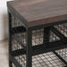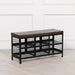 Industrial style metal storage shoe rack bench with black painted metal frame and rustic wooden mango wood top