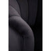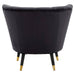 This exquisite chair boasts a barrel design back upholstered in sumptuous black velvet, adorned with vertical channel tufting. The opulent aesthetic is elevated by the black wood legs with decadent gold finish accents.