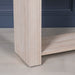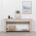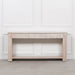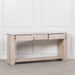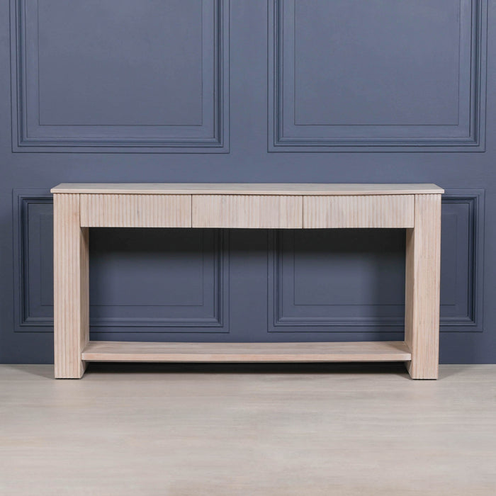 Hand-crafted fluted acacia wooden console with 3 drawers and lower shelf in a bleached washed wood finish.