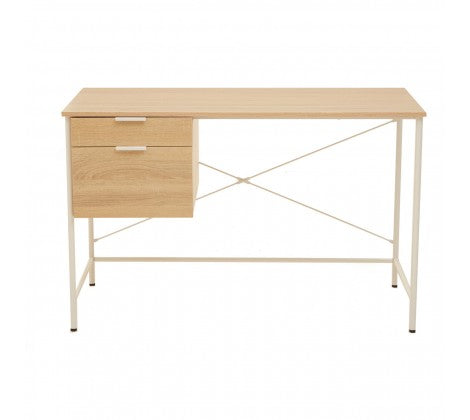 The Bradbury desk is well-suited for a commercial place or home office. The rectangular natural oak effect, wooden top sits neatly upon a white metal frame which is subtly industrial in style. Equipped with two drawers, this desk will keep office and homeschooling spaces decluttered.