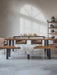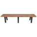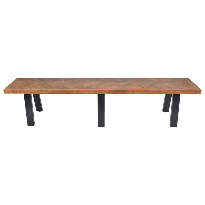 Timeless rectangular bench featuring herringbone inlay wooden top on contrasting black metal powder coated legs. This bench matches our Burnham dining table and has simple clean lines and great eco credentials. As a bi-product of fruit production this wood has warm varying tones which are part of its beauty and ensure every product is unique. Legs detach for convenience making product simple self-assembly.