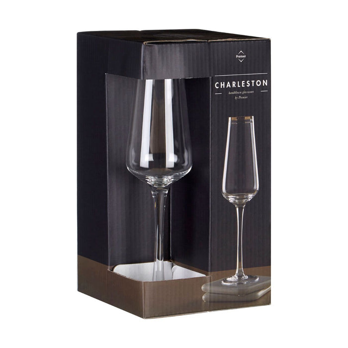 The gold and silver trim on the rim lends each of the four glasses a touch of luxury. The tapered design of the Charleston champagne glasses ensures that their contents will stay fizzy for longer. Individually hand blown, each glass has beautiful silver and gold lines around the rim. Inspired by the decadence that underwrote the art deco period, these glasses are great for special occasions.