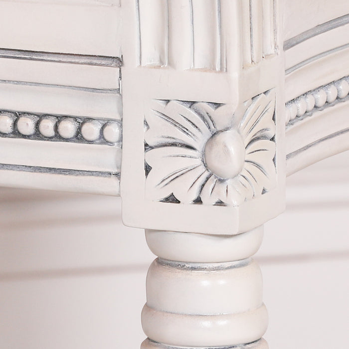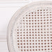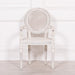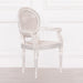Off-white chateau dining/bedroom armchair in a French antique style with a rattan backrest and seat. The mahogany frame has delicate carvings and tapered legs.