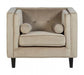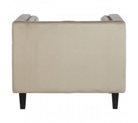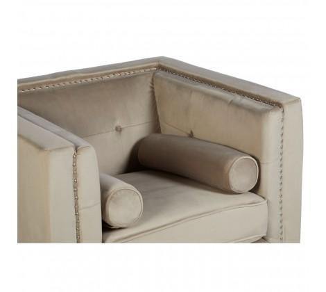 Neutral mink velvet upholstery gives the chair a soft and luxurious feel, with shallow button tufting lending a decorative touch to the backrest. The stylish chair has a square, angular design that is accentuated by silver finish metallic stud detailing. Two cylindrical cushions rest at each side, enhancing the elegant appeal of the chair.