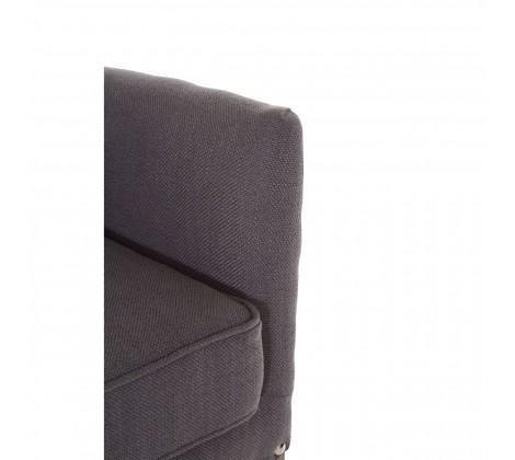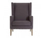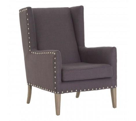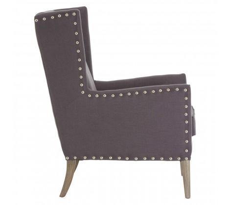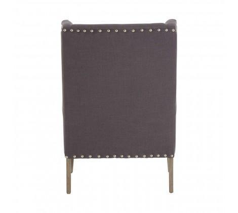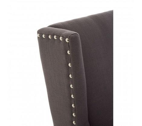 The chair is upholstered in soft gunmetal grey fabric. Silver coloured metal studs form a reflective trim around its outer edge, accentuating its high back and winged arms. Its thick padded seat and backrest adds comfort to the design aesthetic. Tapered legs made from solid oak wood complement the sleek black.