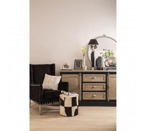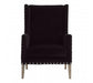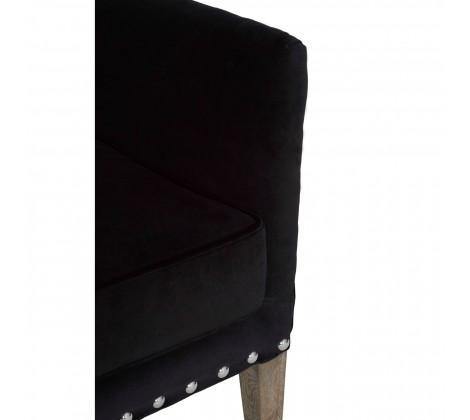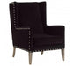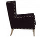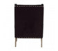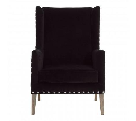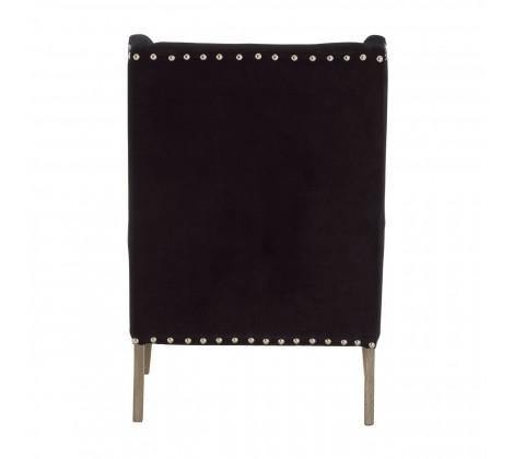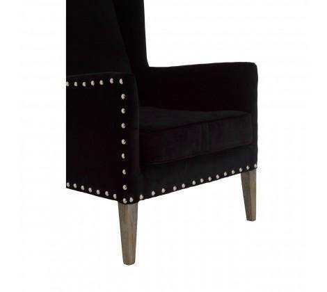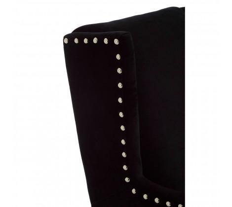 The chair is upholstered in soft black fabric. Silver coloured metal studs form a reflective trim around its outer edge, accentuating its high back and winged arms. Its thick padded seat and backrest adds comfort to the design aesthetic. Tapered legs made from solid oak wood complement the sleek black.