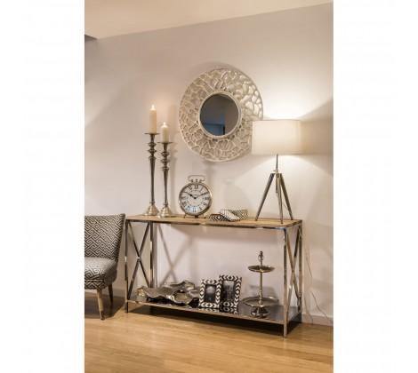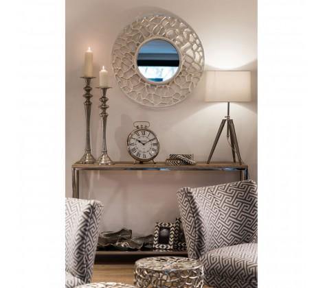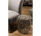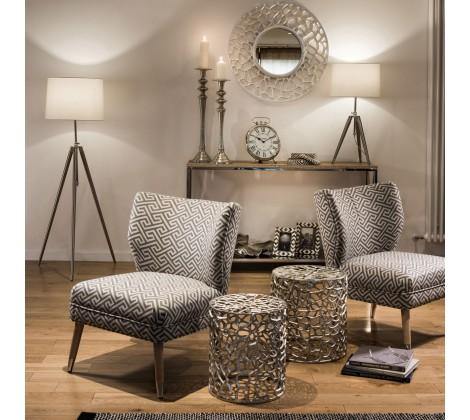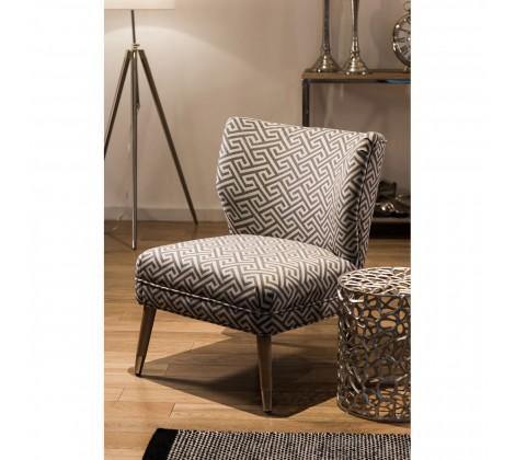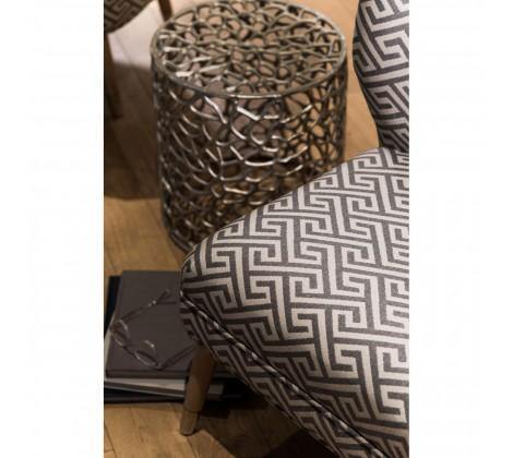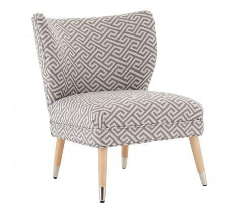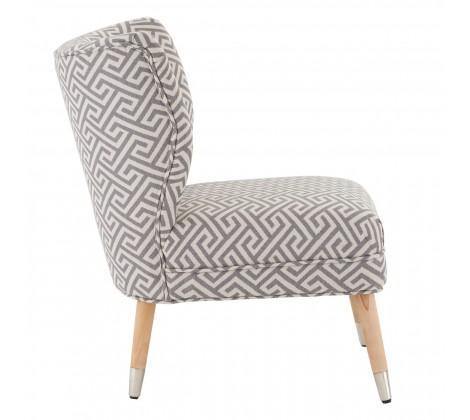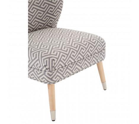 Its cushioned seat and backrest make this chair a joy to sink in to, while the distinctive beige and grey Greek Key pattern design gives it visual appeal. The chair stands on four environmentally friendly rubberwood legs, each one slightly angled, and covered with reflective metal at the bottom. Display it as an accent piece in a mono tribal-styled room.