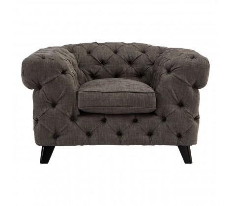 Angled legs, crafted from smooth pine wood, support this classically inspired chair. Their matte black finish compliments the luxurious dark grey fabric upholstery, which itself is tufted for a refined look. A smooth cushion is enveloped by thick padded armrests, their rounded form corresponding with the chair's low profile u-shape design.