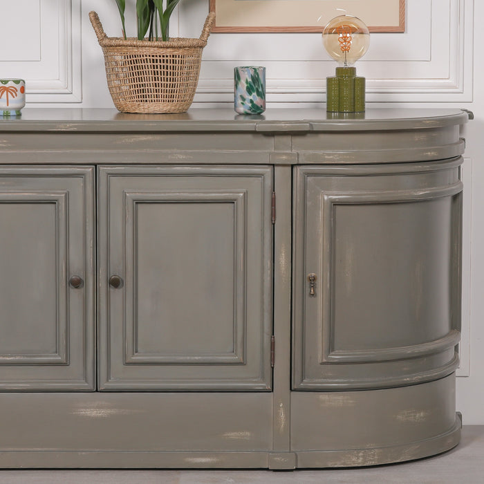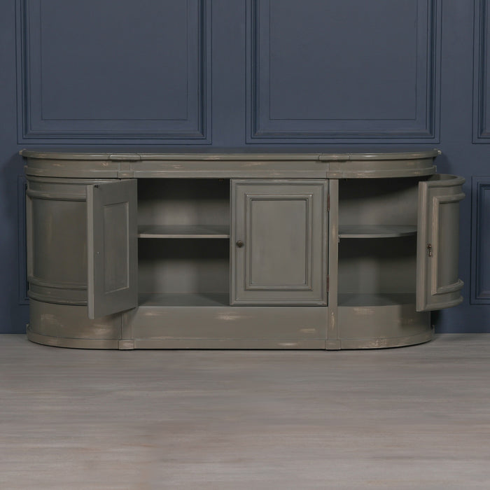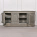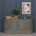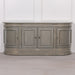 French styled sideboard hand-crafted from mahogany wood with a distressed grey aged finish with tones of rustic heavy distressing to create a vintage design.