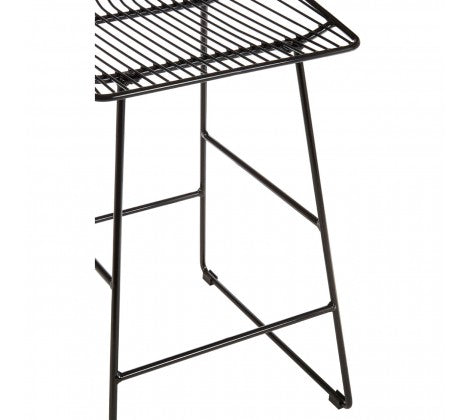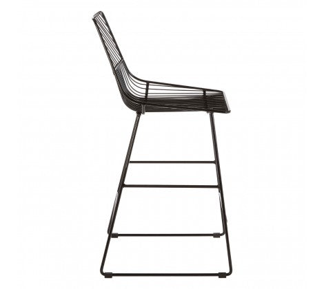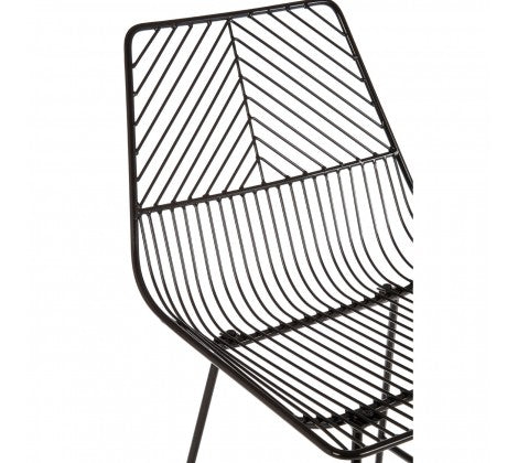 Introduce a geometric accent to the kitchen bar area with the District chair. This highly contemporary bar chair achieves its minimal look thanks to the seat's use of tough black metal wire. Its tapered backrest is divided into three sections, two of which are configured to give the wire design a leaf effect. The third lower section is composed of vertical wires that run through the length of the seat. It stands on elongated A-frame legs which support a wireframe footrest.