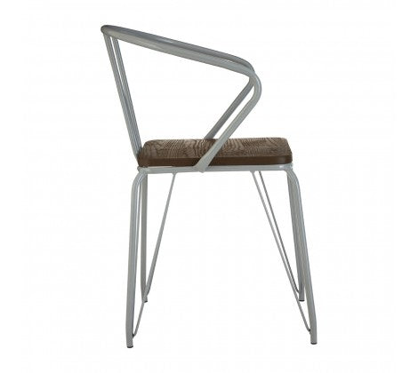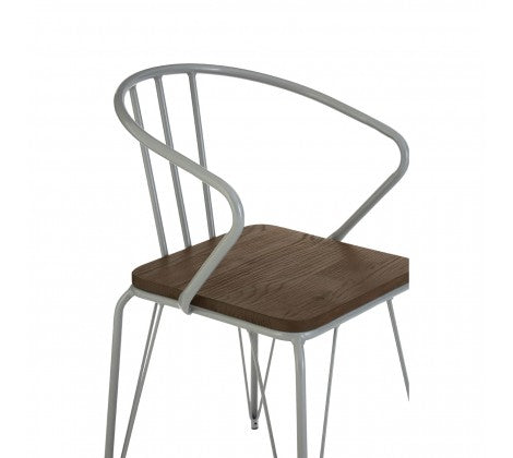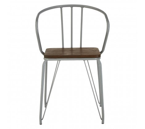This New York loft chair adds soft industrial style to the dining area or living room. The district chair is formed around a frame made from grey metal. It features hairpin legs and a wide and rounded backrest with a trio of vertical tubes running down its central section. The natural elm wood seat boasts a rich grain and textured finish that distinguishes itself from the smooth metal.