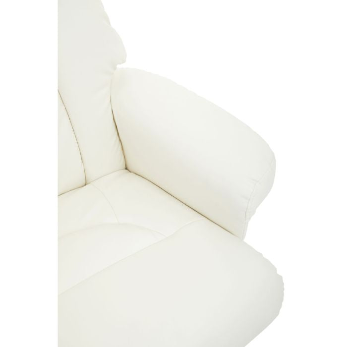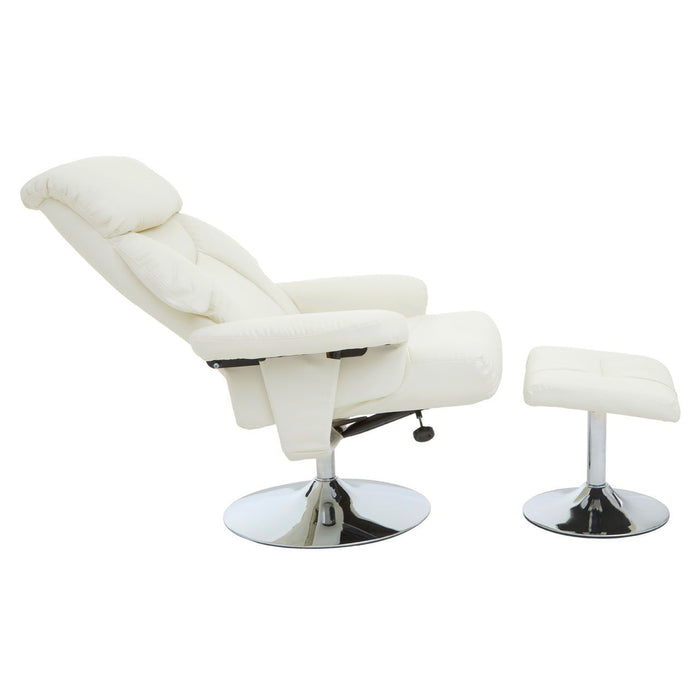 The fusion of PU leather and polished stainless steel base will make a contemporary addition to the urban-inspired décor. This chair is supported by ergonomic armrests and a matching footstool for added comfort.