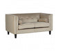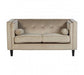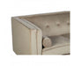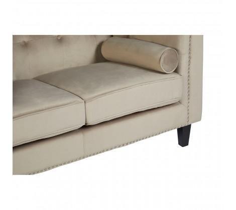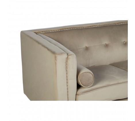 Neutral mink velvet upholstery gives the sofa a soft and luxurious feel, with shallow button tufting lending a decorative touch to the backrest. The stylish sofa has a square , angular design that is accentuated by silver finish metallic stud detailing. Two cylindrical cushions rest at each side, enhancing the elegant appeal of the sofa.