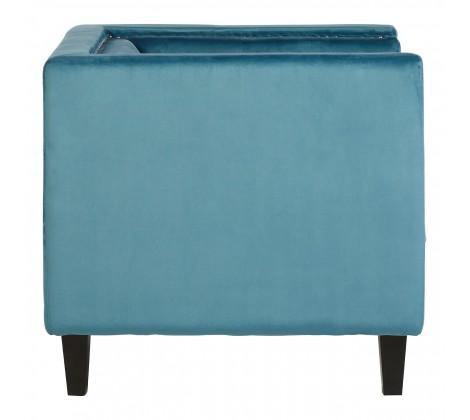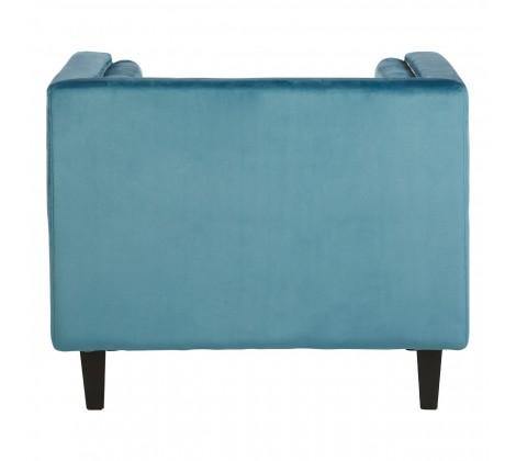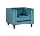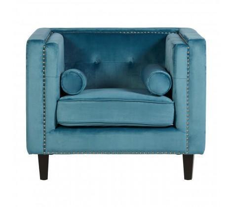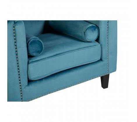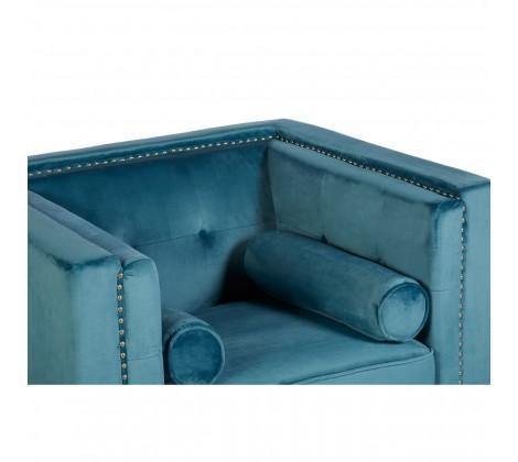 Rich blue velvet upholstery gives the chair a soft and luxurious feel, with shallow button tufting lending a decorative touch to the backrest. The stylish chair has a square, angular design that is accentuated by silver finish metallic stud detailing. Two cylindrical cushions rest at each side, enhancing the elegant appeal of the chair.