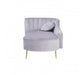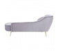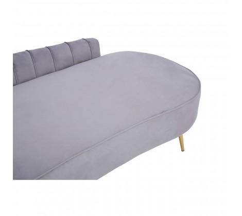 This left arm chaise longue features plush grey velvet upholstery with one round button tufted cushion. A single seat chaise with rounded arms that is curving into a low rounded back will be a perfect modern piece for a classic lounge. It is securely balanced on a sturdy base and warm metallic finished legs.
